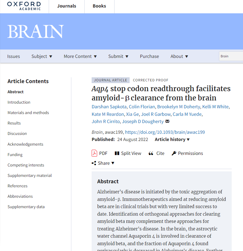 이 연구는 Aqp4 stop codon readthrough facilitates amyloid-β clearance from the brain 라는 제목으로 Brain 학술지에 2022년 최근에 출판되었다.