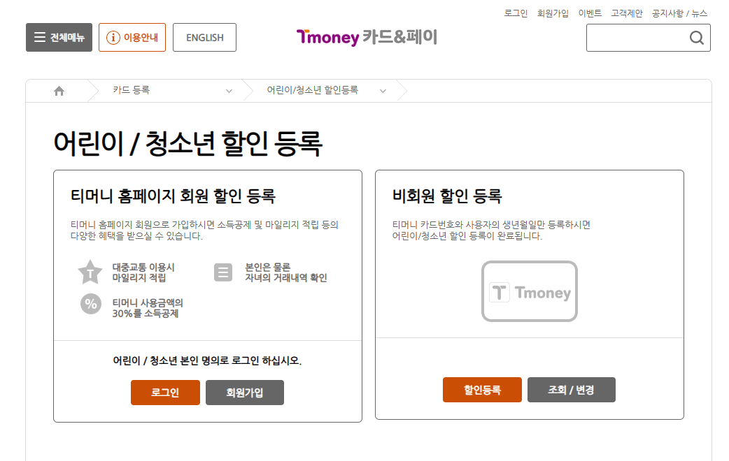 티머니 교통카드 청소년/어린이 등록 방법