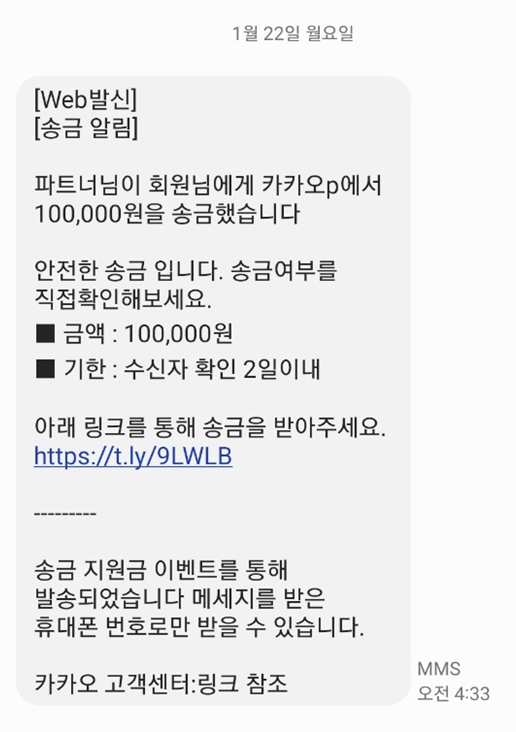 2024년 1월 22일 아래와 같이 카카오p에서 10만원을 송금했다며 확인링크를 클릭하라는 문자가 왔습니다.