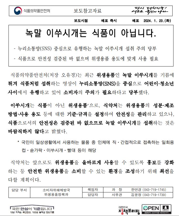 식약처는 녹말 이쑤시개가 일회용 컵, 숟가락, 빨대 등과 같은 위생용품에 속하며, 관련 기준과 규격에 따라 안전성이 관리되고 있음을 밝혔습니다. 그러나 이러한 위생용품의 식품으로서의 안전성은 검증되지 않았으므로 섭취하는 것은 바람직하지 않다고 경고했습니다. 이에 따라 식약처는 앞으로 위생용품의 올바른 사용을 위한 홍보를 강화하고, 안전한 소비 환경 조성에 힘쓸 것임을 밝혔습니다.