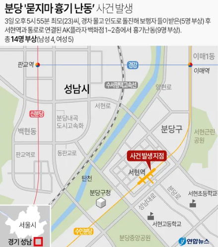 2023년 8월 3일 17시 55분경 경기도 성남시 분당구 서현동의 AK플라자 분당점에서 22세의 남성이 인도를 향해 차량을 돌진한 뒤 불특정 다수에게 칼부림을 일으킨 사건입니다.