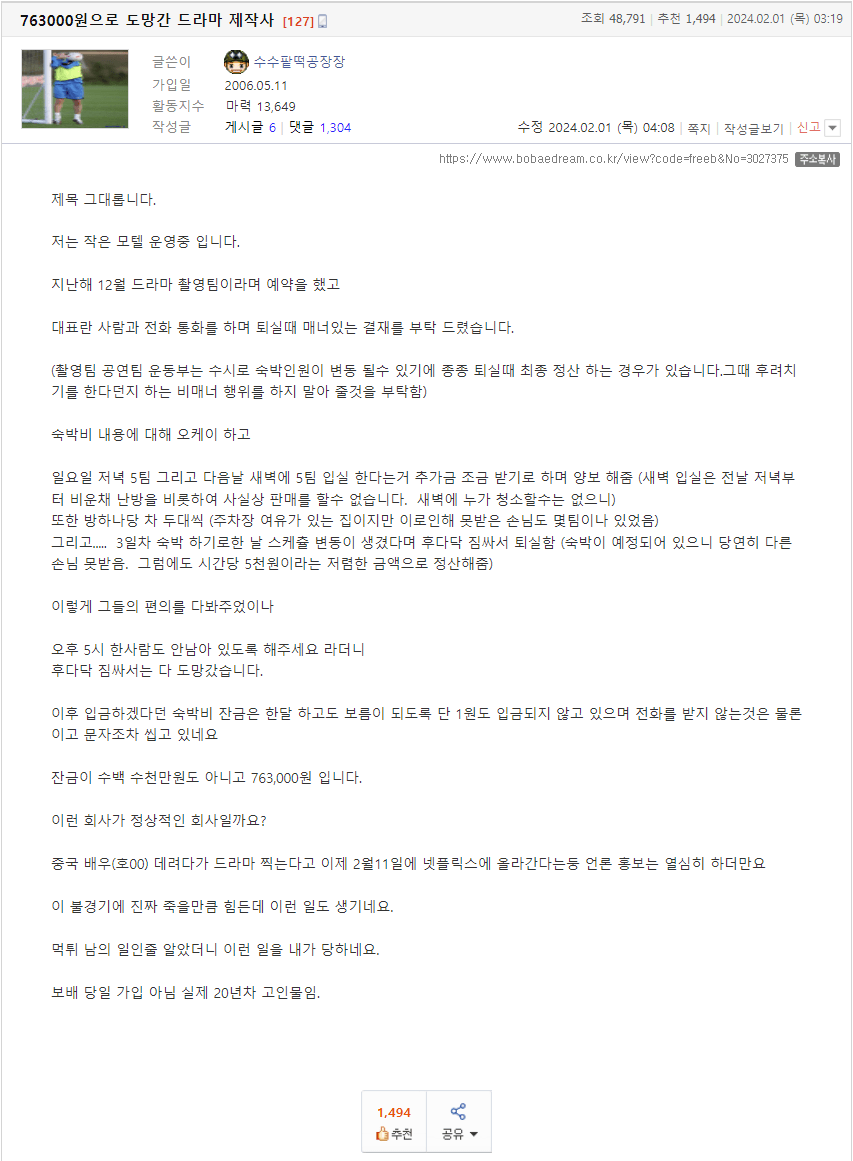 작은 모텔을 운영하는 사장님께서 드라마 촬영팀으로부터 3일간 숙박비 763,000원을 받지 못했다고 하셨습니다.