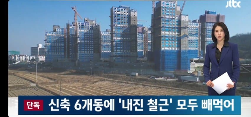 - 경기도 이천의 한 신축 아파트 단지에서 11개동 가운데 절반이 넘는 6개동의 내진설계용 기둥 96개 모두 띠철근이 하나도 들어가지 않은 사실이 확인됨.
