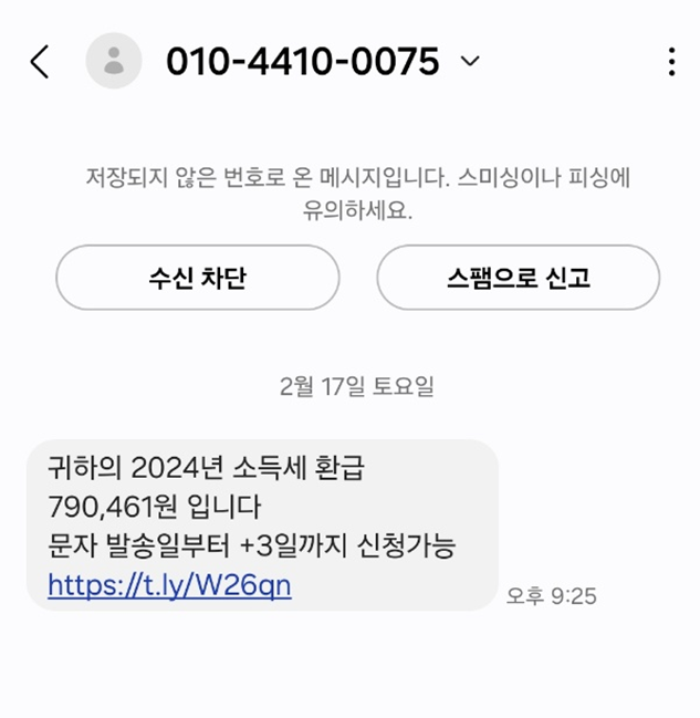카테고리 없음 소득세 환급 스미싱 피싱 문자 주의 mabemi 2024. 2. 19. 11:15 최근 저에게 귀하의 소득세 환급 790,461원 이 있으니 보내준 링크를 클릭해서 받아가라는 문자가 왔습니다. 이 문자는 스미싱 피싱 문자이므로 클릭 하지 마시기 바랍니다. 국세청은 문자에 포함된 URL을 클릭하면 카카오톡 주식 리딩방으로 자동 연결되며, 주식 리딩방 운영자는 고수익을 보장한다는 선전으로 투자를 유인하고 투자금 이체를 요구한다고 설명했습니다. 공유하기 게시글 관리 마배미 아카이브 저작자표시 비영리 변경금지 (새창열림)