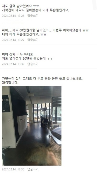 최근 한 회원은 매일경제와의 인터뷰에서 "지난 설 연휴 전 미용실이 회원권을 팔면서 예전보다 더 큰 할인을 약속하고 지역 주민 100여 명에게 수십만에서 수백만 원을 받은 후 갑자기 문을 닫았다"고 밝혔습니다. 피해자들은 설 연휴 전날까지도 미용실이 예약을 받고 있었다고 말합니다.