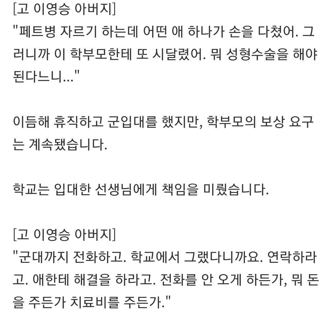 이듬해 이 교사가 휴직하고 군 입대를 한 뒤에도 학부모의 항의는 계속됐다. 군대에까지 전화를 걸어오는 지경이었다. 학교 측은 이 교사에게만 책임을 떠넘겼다. 이 교사의 아버지는 “학교에서는 우리 애한테 (학부모와) 연락해서 해결을 하라고, 돈을 주든가 해서 전화 안 오게 하라고 했다”고 전했다