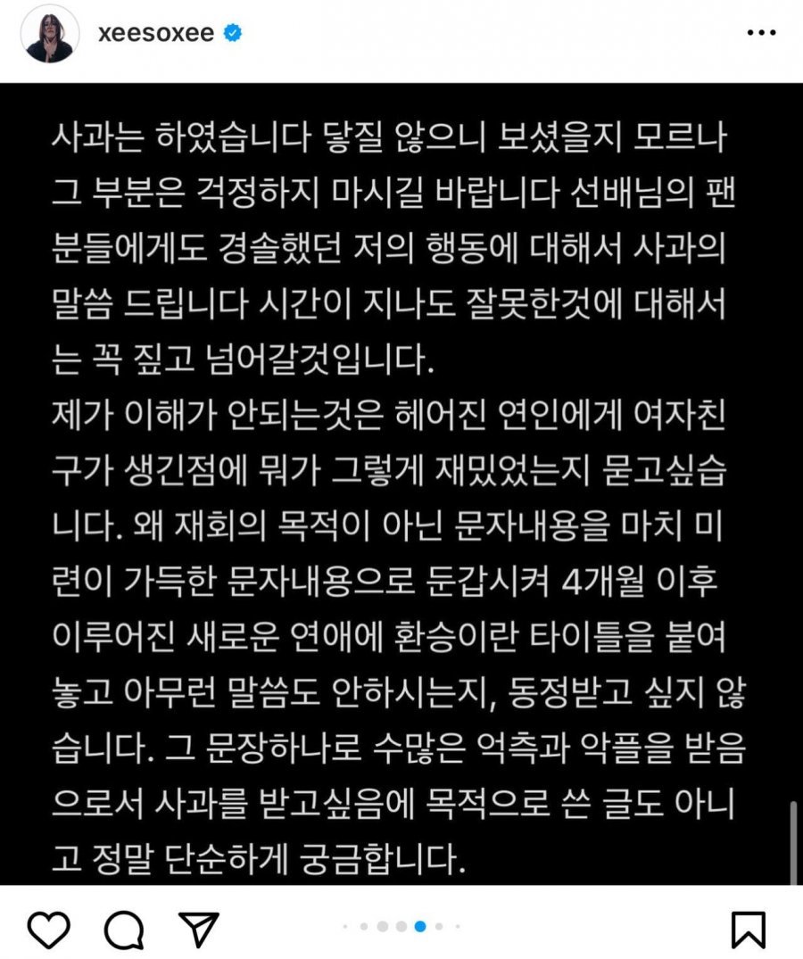 제가 이해가 안 되는 것은, 헤어진 연인에게 여자친구가 생긴 점에 뭐가 그렇게 재밌었는지 묻고 싶습니다. 왜 재회의 목적이 아닌 문자 내용을 마치 미련이 가득한 문자 내용으로 둔갑시켜 4개월 이후 이루어진 새로운 연애에 환승이란 타이틀을 붙여놓고 아무런 말씀도 안 하시는지, 동정받고 싶지 않습니다. 그 문장 하나로 수많은 억측과 악플을 받음으로서 사과를 받고 싶음에 목적으로 쓴 글도 아니고, 정말 단순하게 궁금합니다.