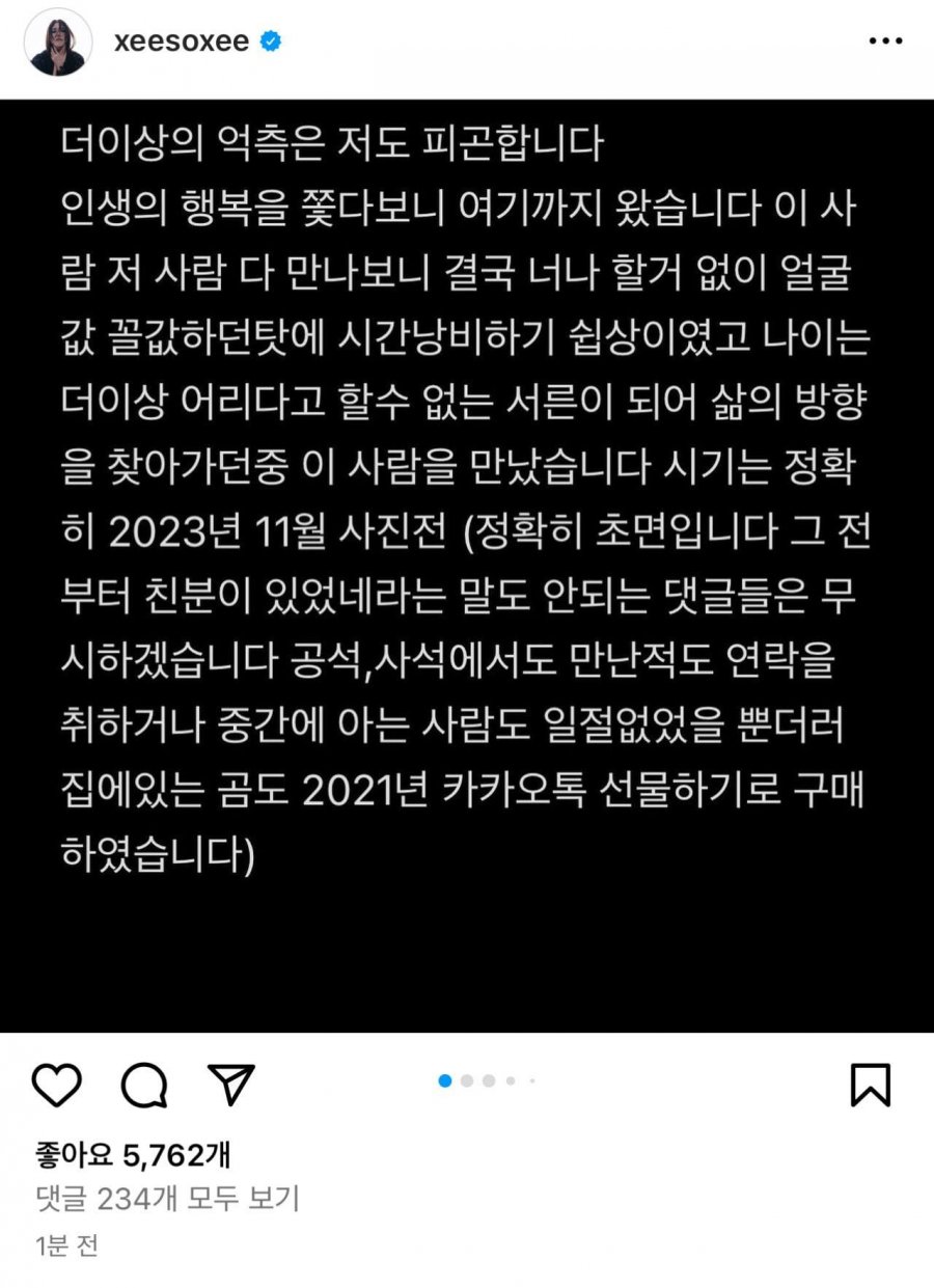 더 이상의 억측은 저도 피곤합니다. 인생의 행복을 쫓다 보니 여기까지 왔습니다. 이 사람 저 사람 다 만나 보니 결국 너나 할 거 없이 얼굴 값 꼴값 하던 탓에 시간 낭비하기 쉽상이었고, 나이는 더 이상 어리다고 할 수 없는 서른이 되어 삶의 방향을 찾아가던 중 이 사람을 만났습니다. 시기는 정확히 2023년 11월, 사진전에서였습니다. (정확히 초면입니다. 그 전부터 친분이 있었다는 말도 안 되는 댓글들은 무시하겠습니다. 공석, 사석에서도 만난 적도, 연락을 취하거나 중간에 아는 사람도 일절 없었습니다. 집에 있는 곰도 2021년 카카오톡 선물하기로 구매했습니다.)