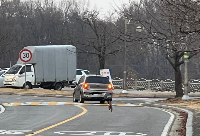 A씨는 이 운전자가 강아지를 잠시 내려놓고 주차를 하려는 줄 알았지만 운전자는 차를 다시 타고 주차장을 빠져나갔다. 강아지는 자신을 두고 가는 차량을 쫓아 도로 한가운데를 내달렸고 차량은 그 상태로 200m 넘게 주행했다.