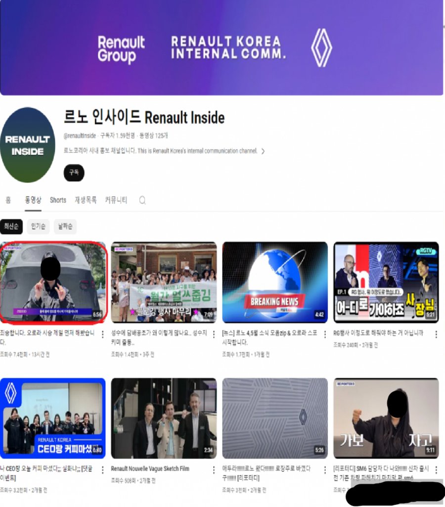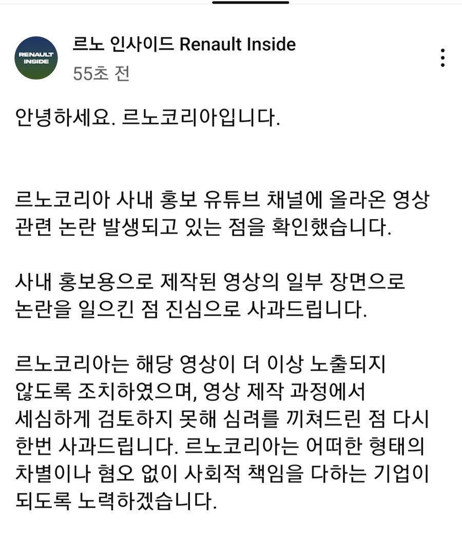 르노 인사이드 Renault Inside 안녕하세요. 르노코리아입니다. 르노코리아 사내 홍보 유튜브 채널에 올라온 영상 관련 논란 발생되고 있는 점을 확인했습니다. 사내 홍보용으로 제작된 영상의 일부 장면으로 논란을 일으킨 점 진심으로 사과드립니다. 르노코리아는 해당 영상이 더 이상 노출되지 않도록 조치하였으며, 영상 제작 과정에서 세심하게 검토하지 못해 심려를 끼쳐드린 점 다시 한번 사과드립니다. 르노코리아는 어떠한 형태의 차별과 혐오 없이 사회적 책임을 다하는 기업이 되도록 노력하겠습니다.