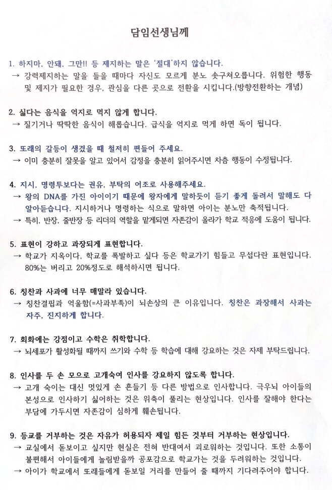 A씨는 당시 B씨에게 "‘하지마’, ‘안돼’, ‘그만’ 등 제지하는 말은 하지 말라", "왕의 DNA를 가진 아이이기 때문에 왕자에게 말하듯이 듣기 좋게 말해달라", "또래의 갈등이 생겼을 때 철저히 편들어 달라" 등 총 9개 항목의 요구사항이 담긴 편지를 보냈습니다.