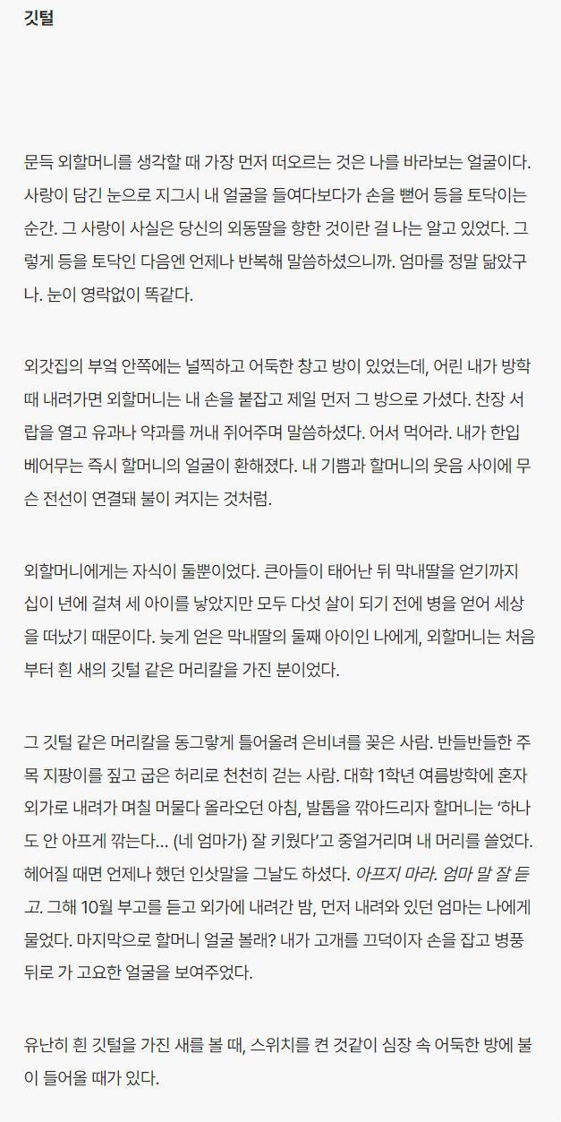 외할머니에게는 자식이 둘뿐이었다. 큰아들이 태어난 뒤 막내딸을 얻기까지 십이 년에 걸쳐 세 아이를 낳았지만 모두 다섯 살이 되기 전에 병을 얻어 세상을 떠났기 때문이다. 늦게 얻은 막내딸의 둘째 아이인 나에게, 외할머니는 처음부터 흰 새의 깃털 같은 머리칼을 가진 분이었다.