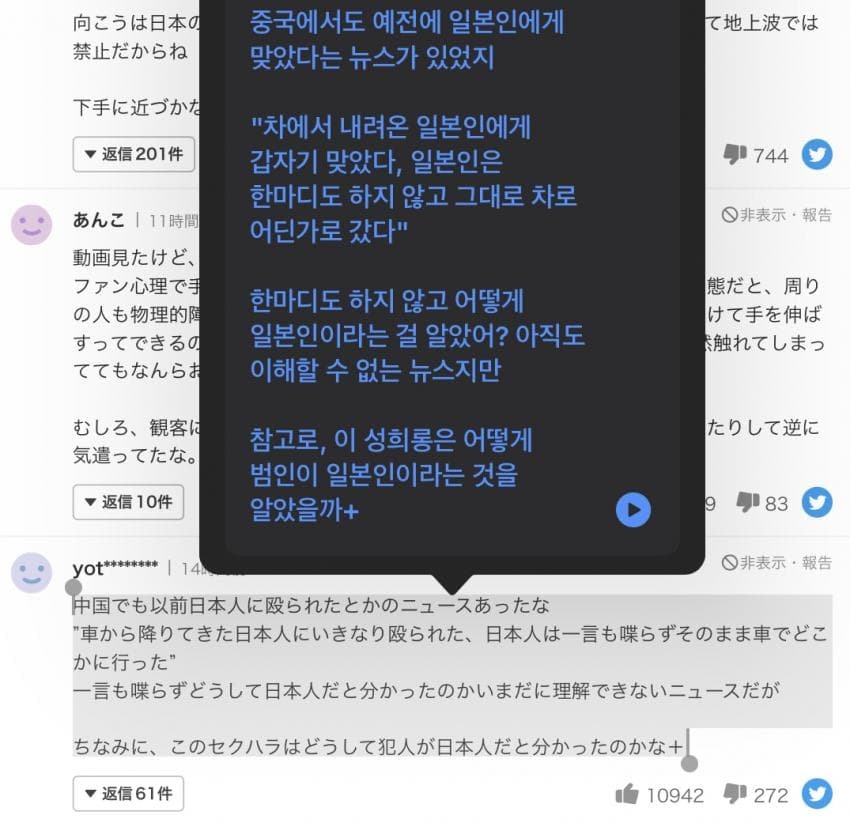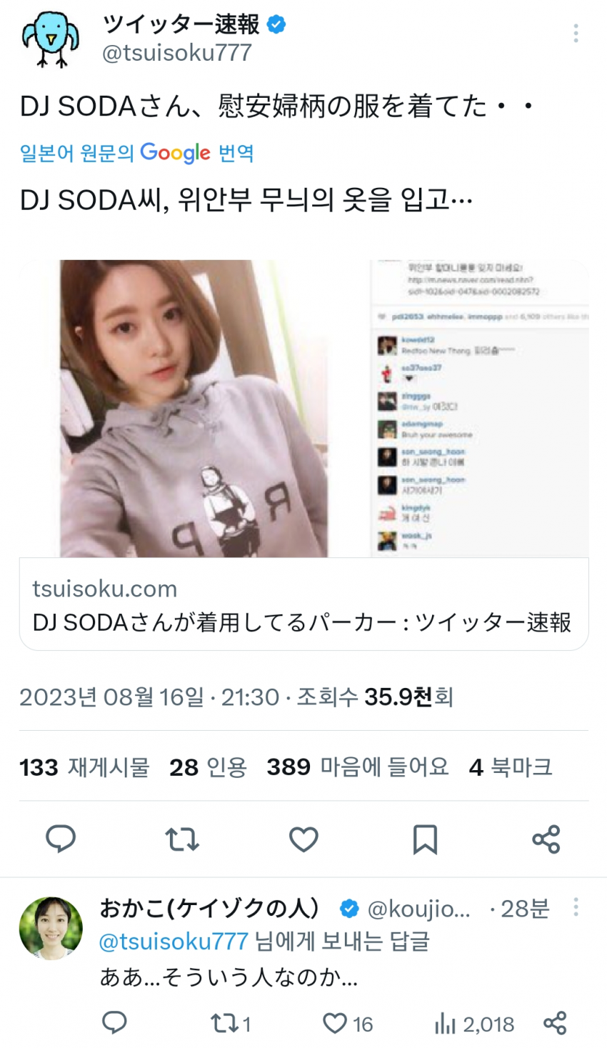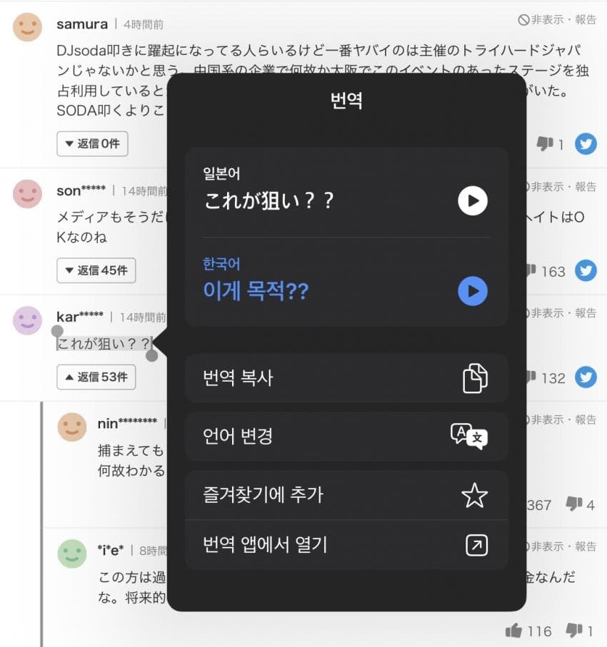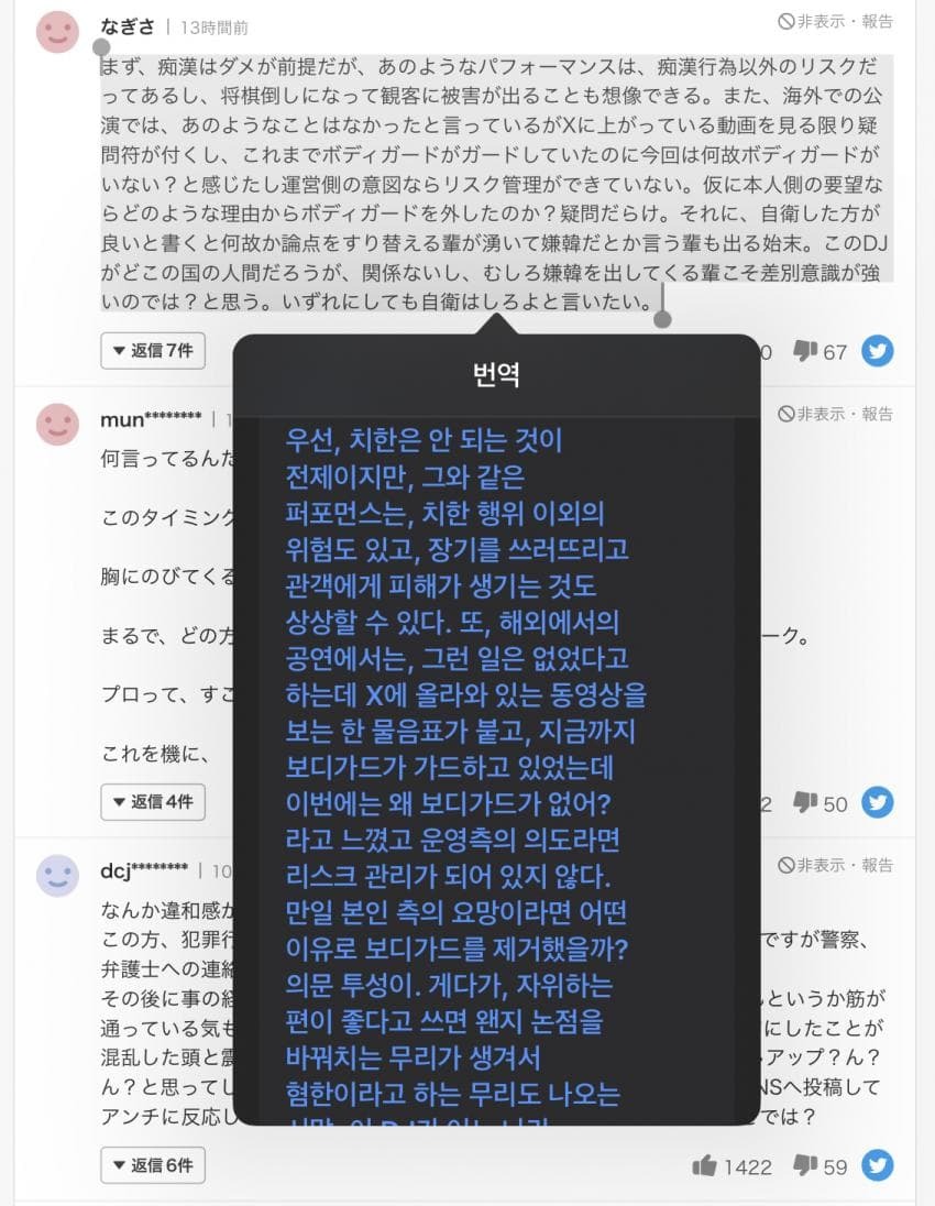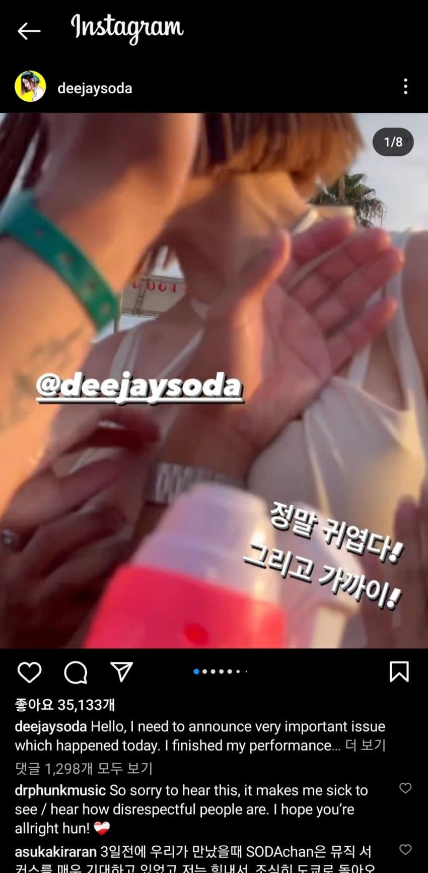 DJ 소다는 14일 자신의 소셜 미디어 계정에 긴 글을 올려 "일본 오사카 뮤직 써커스 페스티벌에서 공연을 마치고 나왔는데, 너무 충격적인 경험을 했고 아직도 두려움에 손이 떨리고 있습니다"라고 밝혔습니다.