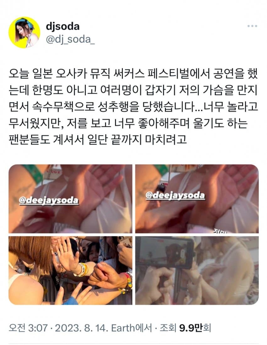 한국의 DJ 소다(본명 황소희)가 일본 공연 현장에서 성추행을 당한 사건을 공개했습니다.