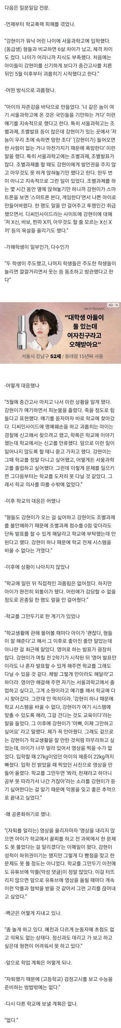“강현이가 워낙 어린 나이에 서울과학고에 입학했다. (동급생) 형들과 비교하면 6살 차이가 났고, 체격 차이도 컸다. 나이가 어리니까 지식도 부족했다. 처음에는 아이들이 강현이를 신기하게 보다가 중간고사를 치른 뒤인 5월 이후부터 괴롭히기 시작했다고 한다.”