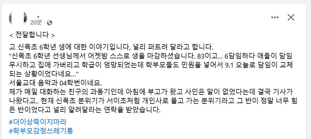 신목초 6학년 선생님께서 스스로 생을 마감하셨습니다.