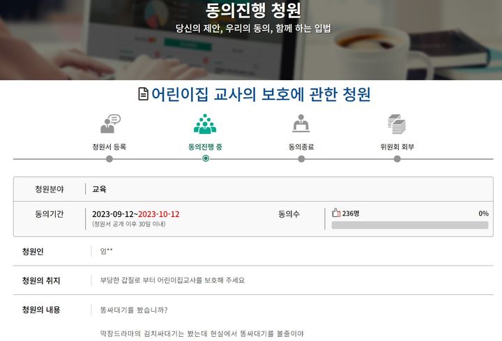 한편, 교사 A씨의 남편은 12일 국회 국민동의청원에 "어린이집 교사의 보호에 관한 청원"이라는 제목으로 글을 올려 사건 발생 과정과 어린이집 보육 교사의 인권 보호를 위한 제도화를 요구했습니다.