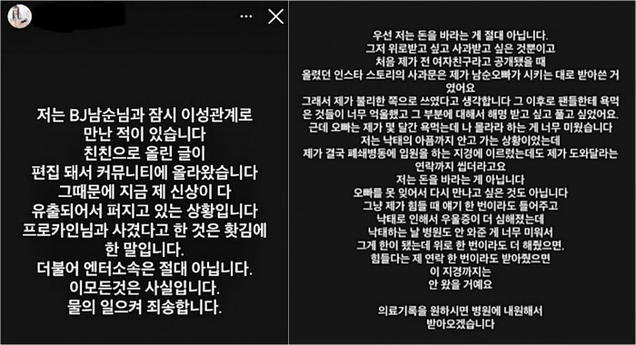 BJ 히콩 BJ남순 아이 임신후 낙태 주장