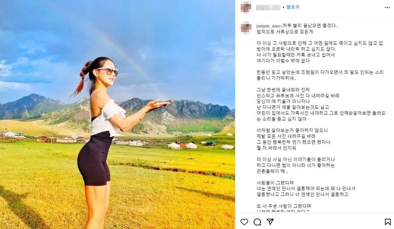 또한 지연씨는 인스타그램과 유튜브에 있는 가족 사진을 모두 삭제해 달라고 요청하며 "이제와서 왜 이렇게 불편하게 되는지 이해가 안 갑니다. 그동안 행복한 척 연기했으면 됐지 않을까요? 왜 더 많은 것을 바라는 건지"라고 비판했습니다.