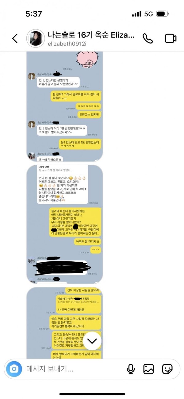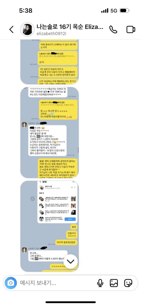 10일, 옥순이가 DM(다이렉트 메시지)를 통해 공개한 것처럼 보이는 '나는 솔로' 16기 단체 대화 내용의 일부가 온라인 커뮤니티 디시인사이드 갤러리에 게재되었습니다.