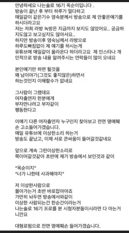 SBS PLUS와 ENA의 '나는 솔로' 16기 방송이 논란에 휩싸였던 후에도 여전히 소란스러운 일들이 계속되고 있습니다. 최근에는 옥순이가 영숙을 명예훼손 혐의로 고소한다고 발표한 후 두 사람 사이의 대화 내용이 공개되었습니다.