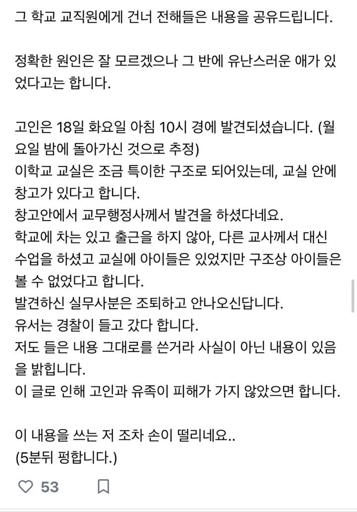 발신인은 “아이들 어린데 선생님 행동 하나하나가 다 큰 영향을 준다는 거 아시죠?”라고 반문하며 “아직 사실관계도 판명나지 않은 일로 이렇게 추모한다는 걸 드러내는 건 아닌 것 같아 연락 드린다”고 쓰여있다.