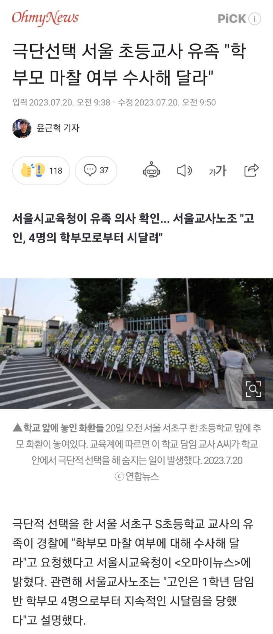 서울의 한 초등학교 교사가 교내에서 극단적 선택을 한 사실이 알려지면서 교사들을 중심으로 추모가 이어지는 가운데 사회관계망서비스(SNS) 프로필을 추모 사진으로 했다가 학부모로부터 항의받았다는 한 교사 사연이 알려져 논란이 일고 있다.