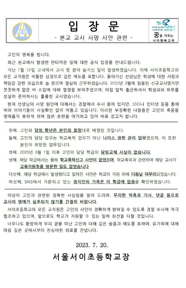 2023.07.19 - [분류 전체보기] - 서이초 교사 자살 사건 소문 내용 (업데이트 중)