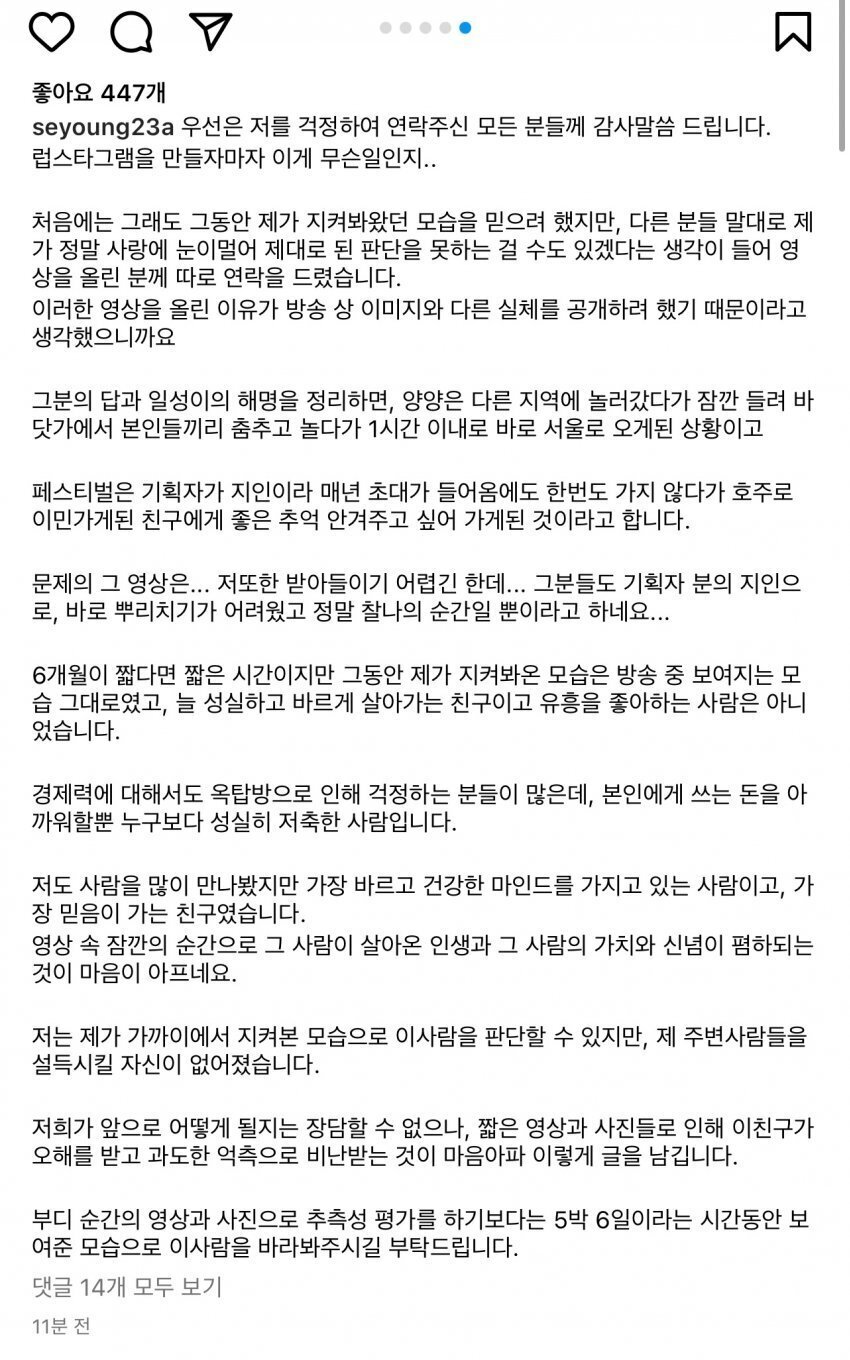 17기 '나는 솔로'의 커플로 발전한 현숙은 상철의 양양 영상에 대한 해명을 했습니다. 자신의 SNS에서 올린 메시지 내역을 공개하며 "양양은 다른 지역에 놀러 간 후 바로 서울로 오게 된 상황"이라고 설명했습니다. 또한 페스티벌 참석은 기획자의 지인으로 초대받아 처음이었으며, 정말 찰나의 순간이었다고 강조했습니다.