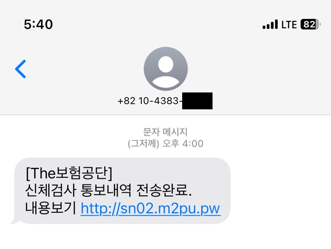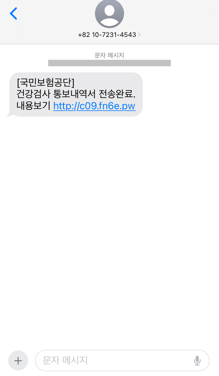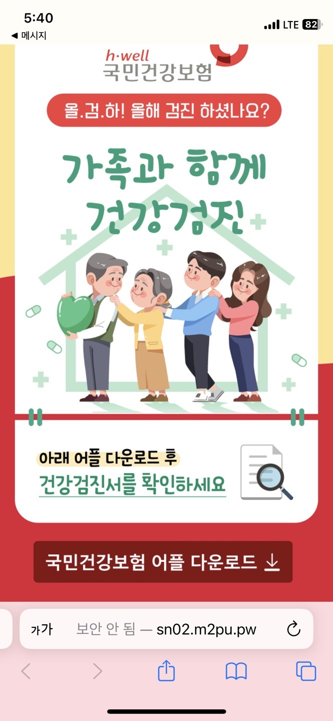 카테고리 없음 보험공단 신체건강검사 통보내역 피싱주의 mabemi 2023. 12. 17. 18:16 보험공단에서 신체검사 통보내역 전송완료 라는 문자메시지와 함께 어플 다운로드 받아서 문진표 작성하라고 합니다. 어플설치를 유도합니다. 설치하면 폰이 해킹됩니다. 주의하시기 바랍니다. 공유하기 게시글 관리 마배미 아카이브 저작자표시 비영리 변경금지 (새창열림)